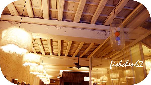 天花板是自然斑駁的白系木作,搭配毛茸茸的白色吊燈